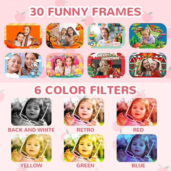 - * 【30 Cornici Divertenti e 6 Filtri】La nostra fotocamera giocattolo è piena di divertimento! Con 30 fantastiche cornici cartoon e 6 filtri cool, possono aggiungere il loro tocco creativo a ogni foto e video. Basta premere le frecce "SU" e "GIÙ" per scegliere i loro preferiti – è facilissimo! Perfetta per bambini dai 3 anni in su, è un regalo ideale per compleanni, Natale e altre festività.