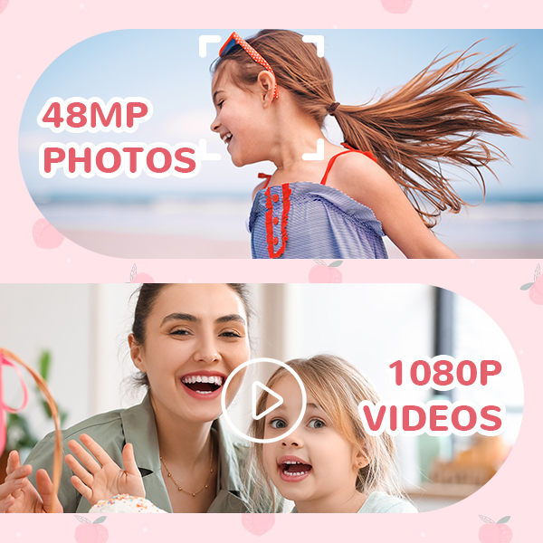 Non lasciatevi ingannare dalle sue dimensioni compatte! La nostra fotocamera digitale giocattolo è dotata di due fotocamere da 48MP, catturando splendide foto da 48MP e video 1080P. Ottimo per scattare selfie e qualsiasi cosa vogliano registrare. Progettato appositamente per i bambini, è facile da usare con il tasto autofocus, basta puntare e premere, e una foto perfetta viene creata e memorizzata. Le dimensioni compatte lo rendono perfetto per le mani piccole.