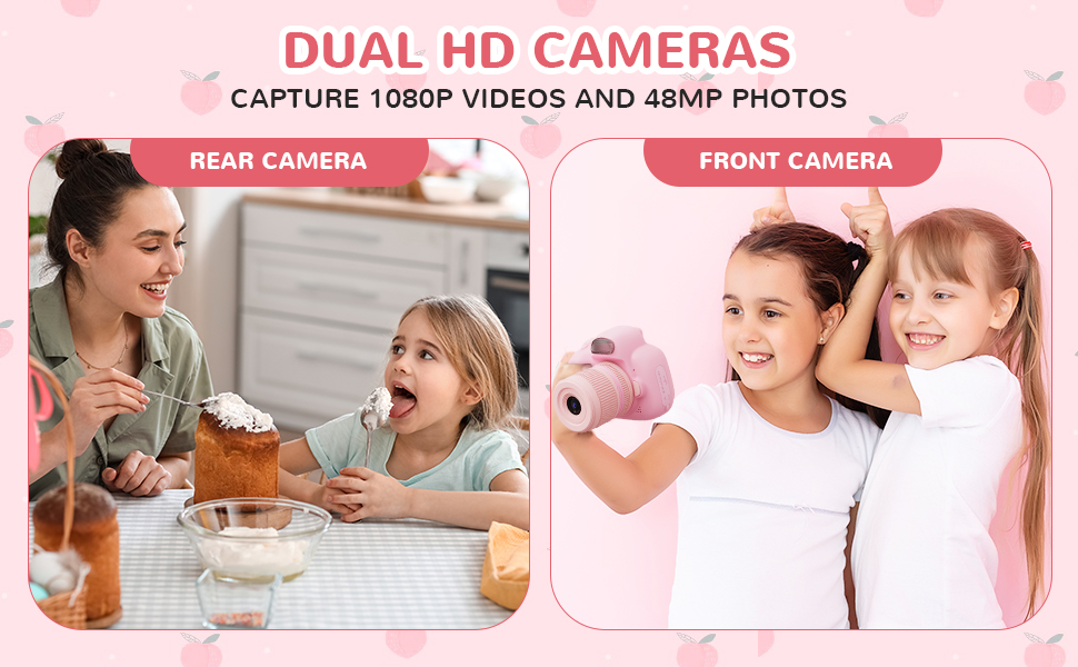 - * 【Doppie Fotocamere, Doppio Divertimento】La nostra fotocamera giocattolo è dotata di due potenti lenti da 48 MP anteriori e posteriori. I tuoi bambini adoreranno scattare selfie con i loro amici e registrare fantastici video delle loro avventure. Con video in 1080P, foto mozzafiato da 48 MP e una luce di riempimento integrata, otterranno sempre foto luminose e nitide, anche in condizioni di scarsa illuminazione. È la fotocamera perfetta per tutto il loro divertimento!