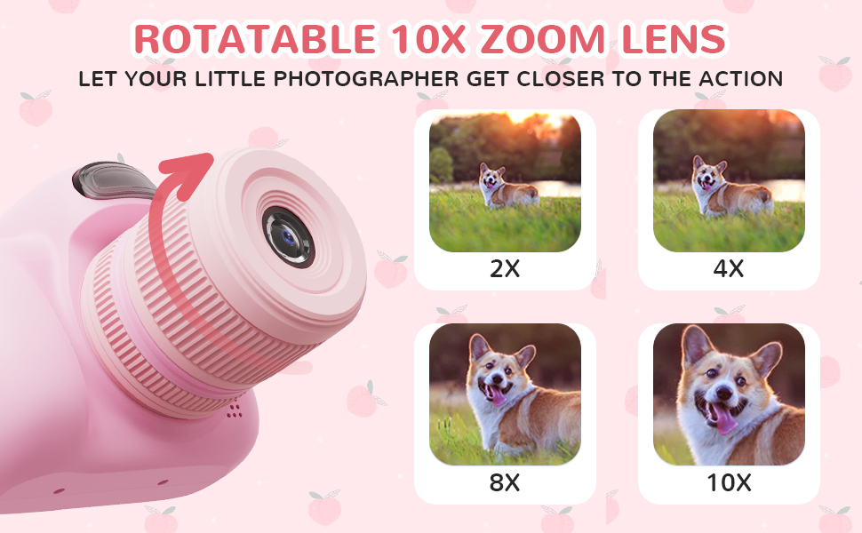 Questa fotocamera adatta ai bambini ha un anello zoom rotante super cool che permette loro di zoomare dentro e fuori come un vero fotografo! Con 10 livelli di ingrandimento, possono avvicinarsi all'azione e catturare tutti i dettagli. Amano girare, ruotare, ruotare e sparare come un professionista!