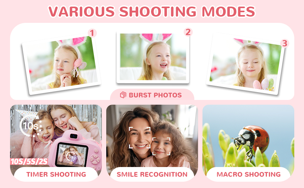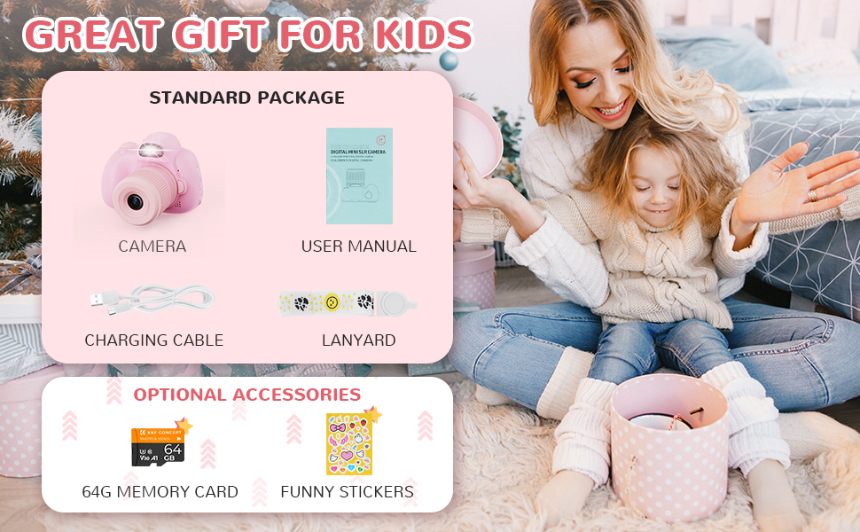 - Questa macchina fotografica giocattolo per bambini divertente e facile da usare è il regalo perfetto per i bambini dai 3 ai 9 anni! È un regalo ideale per Pasqua, Halloween, Natale, compleanni e qualsiasi occasione speciale. La confezione contiene una fotocamera, un cordino e un manuale di istruzioni. Puoi anche scegliere la combinazione con una scheda di memoria da 64 GB e divertenti adesivi per ancora più divertimento!