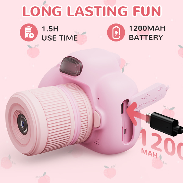 Questa fotocamera digitale per bambini utilizza una batteria ricaricabile, quindi è a risparmio energetico ed ecologico. Inoltre, la batteria da 1200mAh dura fino a 90 minuti con una singola carica e la ricarica è facile con l'ingresso di tipo C.