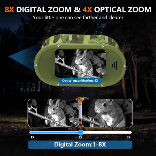 - Zoom digitale 8X: Che si tratti di osservare la fauna selvatica lontana o di cercare tesori nascosti, questa funzione di zoom aiuta la tua piccola avventura a vedere tutti i dettagli.