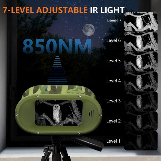 - Luce IR a 7 livelli: Se è nero pezzo o se stai guardando qualcosa di lontano, basta alzare la luce IR per una visione chiara e luminosa. Per oggetti più vicini o quando c'è un po' di luce intorno, puoi abbassarla per evitare troppa luminosità e risparmiare batteria.