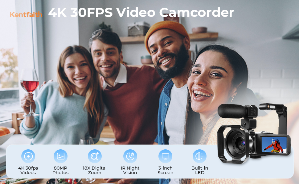 Videocamera con Video 4K 30FPS, Foto 80MP, CMOS Sony 13MP, 11 Accessori, Visione Notturna, Modalità Webcam, Kentfaith