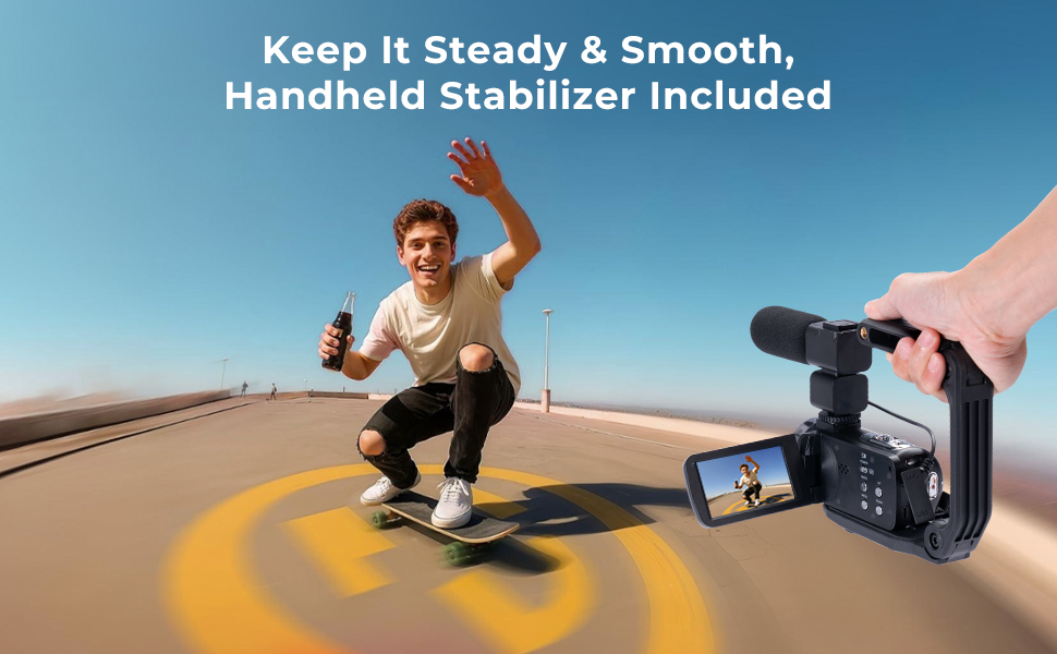 Cattura ogni momento emozionante con facilità! Lo stabilizzatore portatile della nostra videocamera 4K mantiene stabili le tue riprese, mentre il parasole evita la sovraesposizione anche nelle giornate di sole intenso.