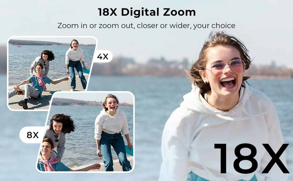 Kentfaith videocamera offre uno zoom digitale 18X, permettendoti di avvicinarti all'azione senza muovere un passo. Cattura ogni espressione, ogni momento e inquadra perfettamente il tuo scatto: che si tratti di una festa vivace, di un raduno familiare o di un'avventura all'aperto.