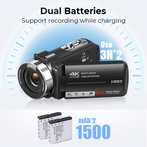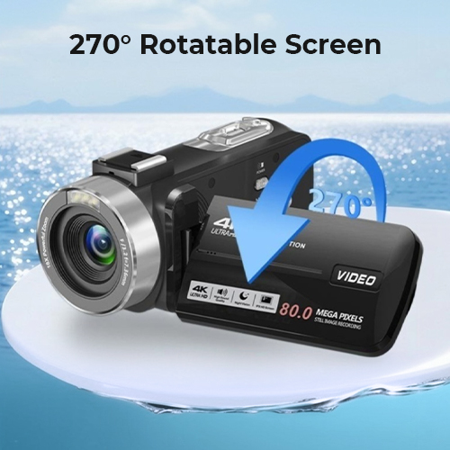 - * Angoli Flessibili e Lunga Durata di Registrazione: Lo schermo rotabile da 3" e 270° ti permette di inquadrare da qualsiasi angolazione, che tu stia filmando te stesso o altri. Controlla la tua videocamera a distanza con il telecomando incluso e goditi fino a 4 ore di registrazione continua con due batterie ricaricabili—abbastanza energia per eventi familiari, feste o vlog di viaggio.