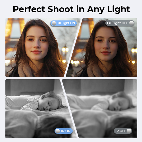 La luce di riempimento integrata illumina i tuoi soggetti per foto perfette in condizioni di scarsa illuminazione, mentre la modalità visione notturna IR ti consente di registrare chiaramente anche al buio completo.