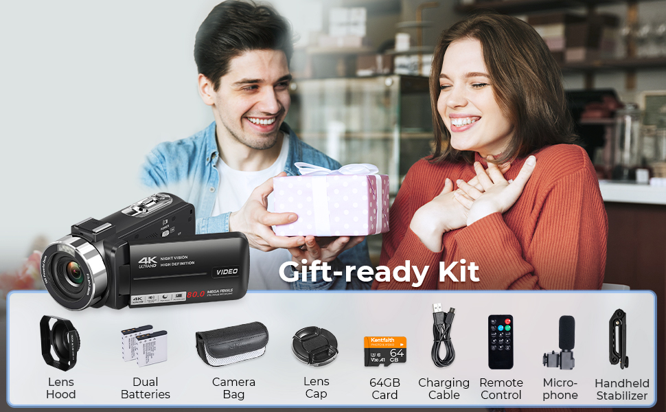 Insieme a video 4K nitidi, la videocamera Kentfaith è progettata per essere semplice da usare per tutte le età e livelli di abilità. Abbiamo incluso ogni accessorio essenziale: microfono, stabilizzatore, scheda da 64GB e altro ancora, così da offrirti un kit completo per creatori in una sola scatola. Niente acquisti extra, niente confusione. Basta aprire la confezione, accendere e iniziare a creare.