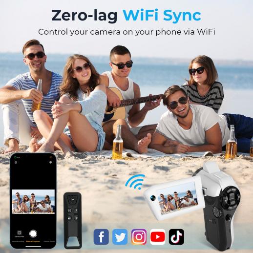 - * <b>Telecomando & Sincronizzazione WiFi Istantanea</b>: Rimani dietro la videocamera per vlog, senza dover correre avanti e indietro. Con il telecomando 2.4G incluso, puoi controllare la registrazione a distanza, perfetta per scatti di gruppo o vlog senza mani. L'integratore WiFi ti consente di visualizzare l'anteprima, regolare le impostazioni e trasferire video o foto direttamente sul tuo telefono o tablet. Condividi le tue avventure all'istante con famiglia,