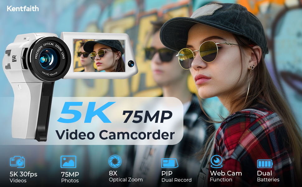Videocamera 5K con foto da 75MP, Zoom Ottico 8X, Trasferimento WiFi, Microfono Senza Fili, Doppia Batteria, Supporto Registrazione PIP, Kentfaith