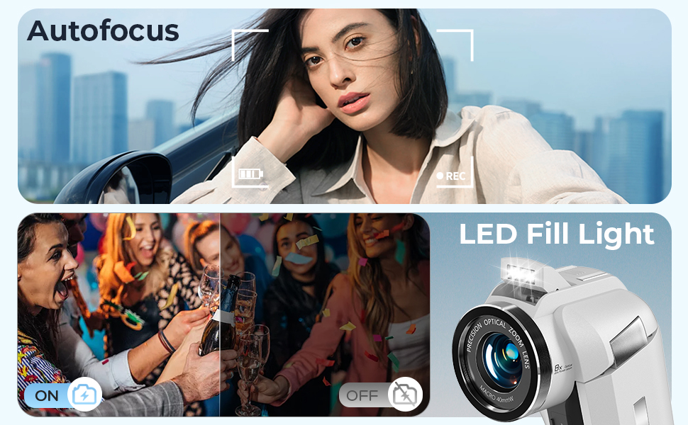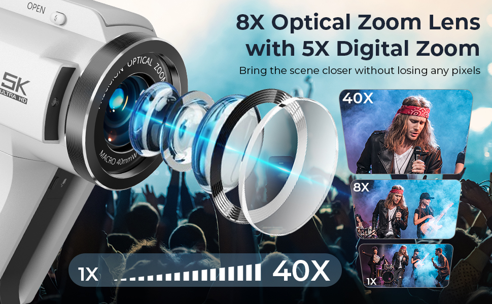 - * <b>Potente Zoom Ottico 8X e Messa a Fuoco Macro</b>: Avvicina il soggetto senza muoverti di un centimetro. La videocamera Kentfaith offre uno zoom ottico 8X e uno zoom digitale 5X, permettendoti di inquadrare vedute lontane, catturare eventi sportivi o zoomare su momenti speciali con nitidezza. Supporta la fotografia macro fino a 10 cm di distanza. Dai panorami mozzafiato ai primi piani dettagliati, questa videocamera rende ogni scatto importante.