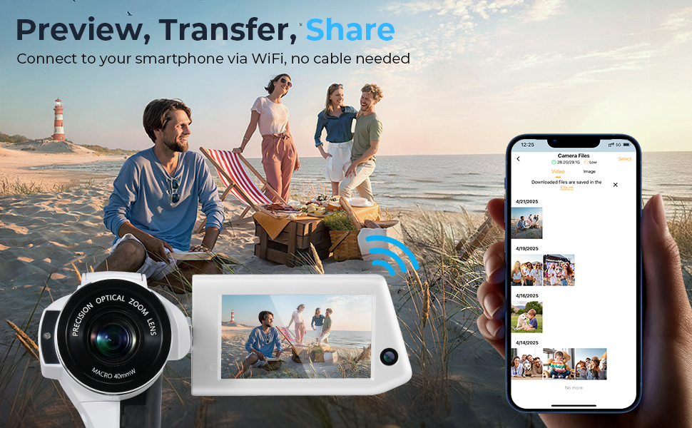- Collega la fotocamera per vlog Kentfaith 5K al tuo telefono o tablet tramite WiFi. Puoi visualizzare in anteprima le tue riprese in tempo reale, regolare le impostazioni al volo, scattare senza uso delle mani e, cosa più importante, trasferire i tuoi capolavori direttamente sul tuo dispositivo. Carica immediatamente su Instagram o YouTube e lascia che i tuoi follower siano parte del momento, proprio mentre accade.