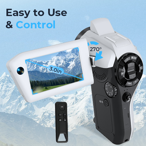 Progettato per registrazioni prolungate, l'innovativo manico offre una presa comoda e sicura, rendendolo piacevole da usare. Lo schermo è ruotabile di 270°, permettendoti di riprendere da qualsiasi angolazione. Include un telecomando per riprese a distanza senza uso delle mani.