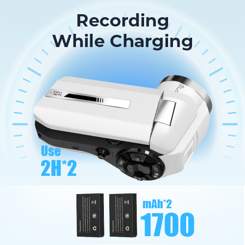 Includiamo due batterie ricaricabili da 1600mAh per un totale di 4 ore di ripresa e, con il supporto per la registrazione durante la ricarica (cavo Type-C), non perderai mai un momento dell'azione durante un festival, una riunione festiva o nel tuo vlog.