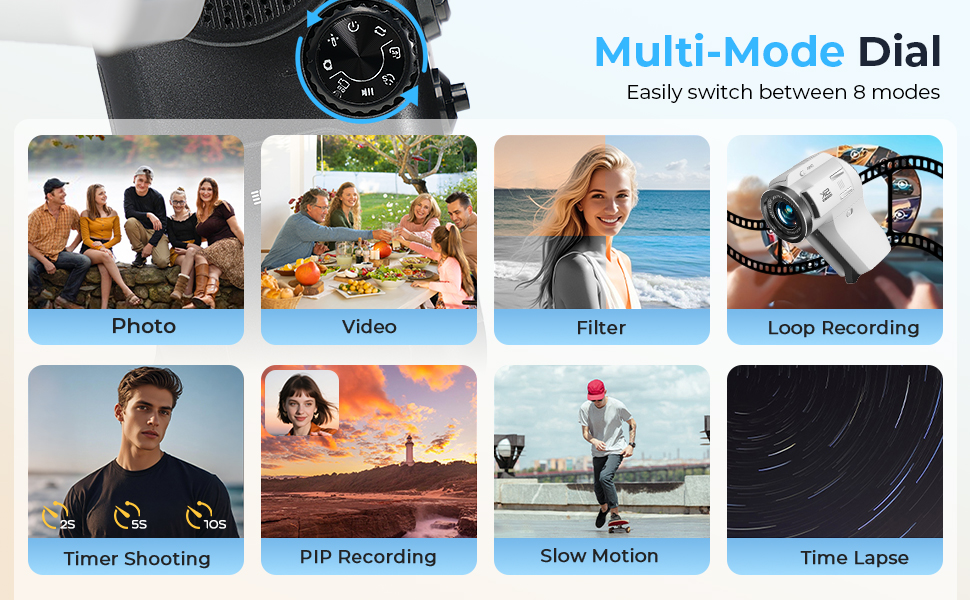 - Con una semplice rotazione della ghiera, puoi passare facilmente tra otto modalità di ripresa. Oltre alle funzioni standard di foto e video, potrai anche goderti: