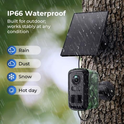 Costruita per resistere alle intemperie, questa telecamera solare esterna resiste a pioggia, neve, nebbia e calore, proteggendo il tuo ranch, capanna, garage o cantiere senza preoccupazioni. Note: Sigillare il tappo di gomma dopo l'accensione.