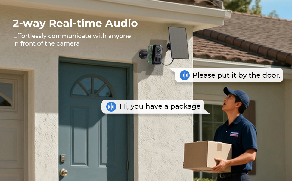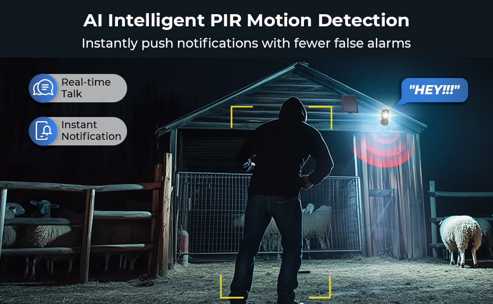 - * Avvisi di movimento intelligenti e audio bidirezionale: Ricevi avvisi importanti. La nostra telecamera solare wireless è dotata di un sensore PIR intelligente, che rileva il movimento di persone e animali, inviando una notifica direttamente al tuo telefono ignorando i falsi allarmi. Utilizza il microfono e l'altoparlante integrati per un audio bidirezionale cristallino per salutare i visitatori, dare istruzioni o spaventare gli intrusi in tempo reale da qualsiasi luogo.