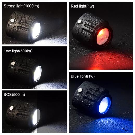 - * [Modalità illuminazione]: luce a 3 colori (bianco, rosso, blu) per soddisfare le diverse esigenze di illuminazione. Luce bianca S1: alta e bassa lampeggiante spenta, commutazione ciclica; Luce bicolore S2: luce rossa e luce blu spenta, commutazione ciclica, funzionamento semplice e veloce;