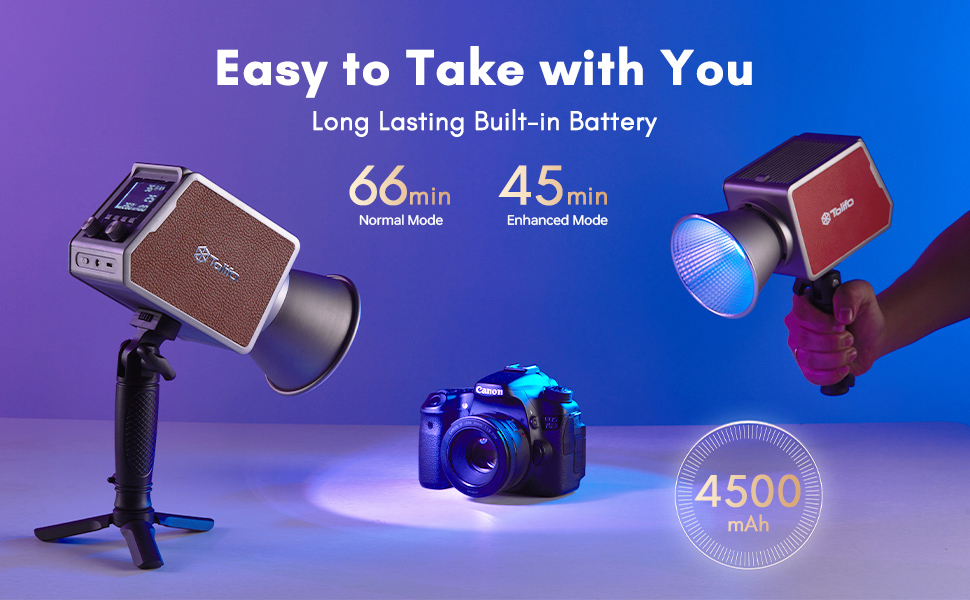 - * 【Batteria integrata da 4500 mAh】L'illuminazione fotografica dura fino a 75 minuti in modalità normale e 45 minuti in modalità migliorata. 2 opzioni di ricarica semplificano la vita: una porta Type-C per l'uso e la ricarica simultanea (perfetta per il power bank in movimento) e una porta DC per la massima uscita. Ideale per riprese all'aperto, streaming dal vivo, produzione di film, vlogging o qualsiasi ambiente senza accesso all'elettricità.