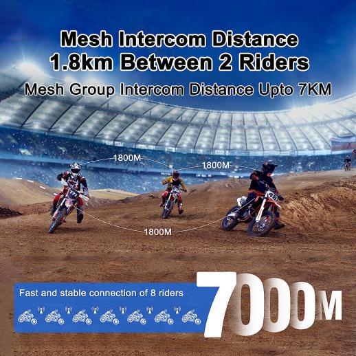 La distanza massima intercom tra due persone per il citofono mesh MS8 può raggiungere 1,8 km, e la distanza intercom tra gruppi di 8 persone può raggiungere 3,5 km-7 km. La distanza intercom ultra-lunga può portare un'esperienza di viaggio diversa in qualsiasi situazione. Nessuna preoccupazione per eventuali ostacoli stradali, come alti edifici, montagne, angoli stradali, strade affollate, autostrade ondulate.