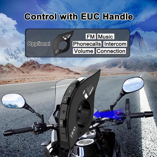 È possibile utilizzare il telecomando EJEAS EUC moto per controllare questo sistema di comunicazione del casco Bluetooth del motociclo MS8, per l'accoppiamento Bluetooth, interfono in tempo reale, ricezione telefonica, controllo musicale, controllo del volume, sveglia dell'assistente vocale, ecc. Maniglia di controllo EUC NON è inclusa.