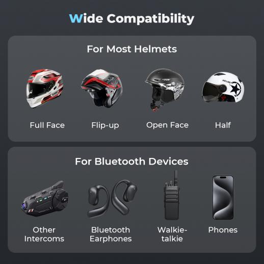 - Preparati per qualsiasi corsa con il nostro citofono auricolare Bluetooth – progettato per adattarsi in modo sicuro a tutti i tipi di casco, sia che si tratti di un casco full-face, 3/4 faccia, open-face o half-face, rimane saldamente sul casco, garantendo un'esperienza senza soluzione di continuità per motociclisti, ciclisti, motociclisti di motoslitta, agenti del traffico, corrieri e non solo.