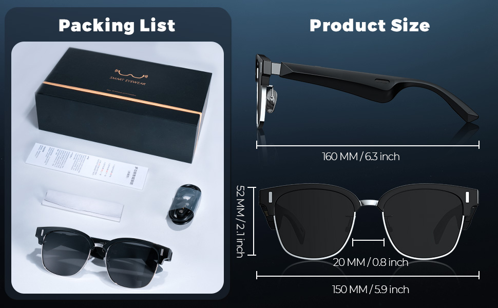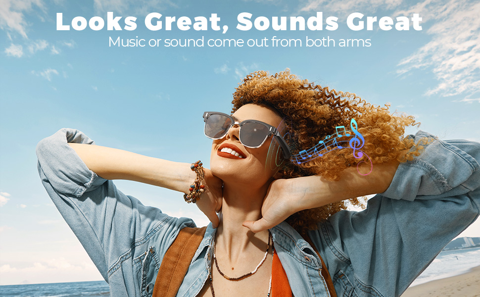 - * 【Gli occhiali da sole che cantano】: I nostri occhiali da sole intelligenti combinano altoparlanti e microfoni in un design elegante e leggero, in modo da poter ascoltare musica e chiamate a mani libere senza il fastidio di auricolari separati. La vestibilità sicura e confortevole significa che rimarranno fermi tutto il giorno, sia che tu sia fuori per una corsa o solo per fare commissioni. Niente più componenti aggiuntivi ingombranti o fili aggrovigliati: solo audio di alta qualità senza sforzo
