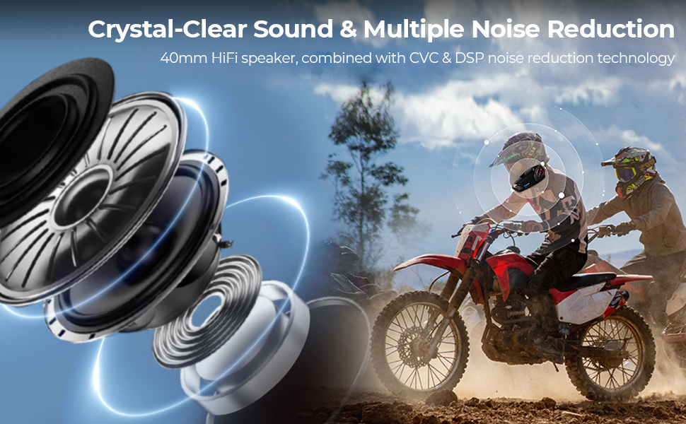 - * 【Immergiti nel suono premium】Scopri la qualità audio eccezionale con le nostre cuffie Bluetooth per moto. Grazie all'avanzata cancellazione del rumore DSP e CVC e agli altoparlanti HiFi da 40 mm, le distrazioni svaniscono, consentendo chiamate chiare anche a una velocità di 120 km/h. Goditi un suono cristallino durante la navigazione in autostrada o esplorando strade secondarie, sia per la musica, la navigazione GPS o le chiamate a mani libere.