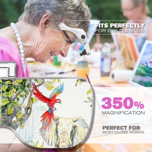 As a versatile headband magnifier. it comes with 5 lenses ( not cheap plastic ), magnification from 1X-3.5X. Smart interchangeable design allows you easily change the lens as you wish. At full power, it magnifies small items by up to 350%. It is also light (8.8 ounces) and has a well-balanced frame that fits comfortably on the head of users. Depending on the project that you are working on, you can customize its system to deliver the best results.