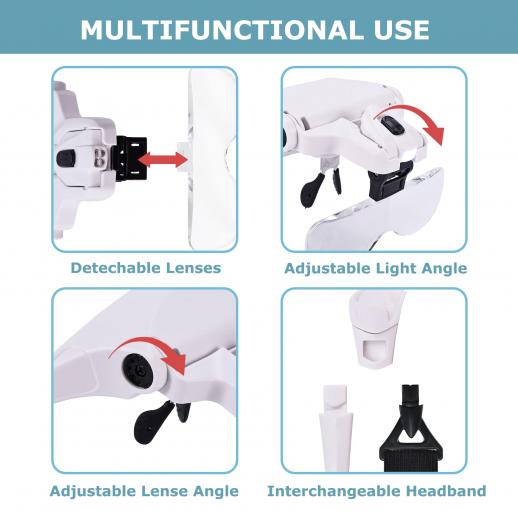 Le lenti di ingrandimento per archetto sono potenti dispositivi vivavoce che consentono di lavorare facilmente con i minimi dettagli. La versatilità di ha aiutato per tanti lavori ravvicinati come dentisti, elettricisti, gioiellieri, cucito, artigianato, bellezza e pittura.