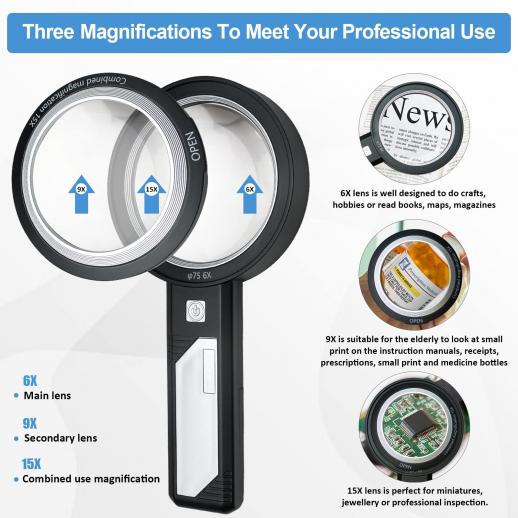 Magnification 6x, 9x and 15x more options: 600% & 900% & 1500% magnifying glass is composed of high definition, high transmittance and natural magnifying glass. It allows visually impaired users to read books, newspapers, maps, etc., regardless of their size.