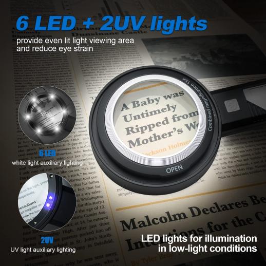 6 White LED lights and 2 UV lights: the magnifying glass provides adjustable light, and the touch switch can select white light or purple light to reduce eye fatigue caused by reading at night and effectively protect eyes.