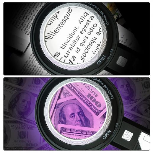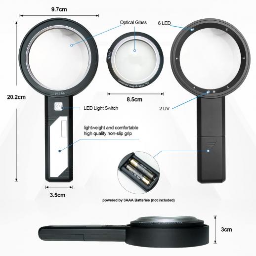 - * 6 LED e 2 lampade UV: dotato di 6 LED e 2 lampade UV, fornisce un ingrandimento cristallino anche in condizioni di scarsa illuminazione, le lampade UV possono essere utilizzate per la verifica di valuta e monete;