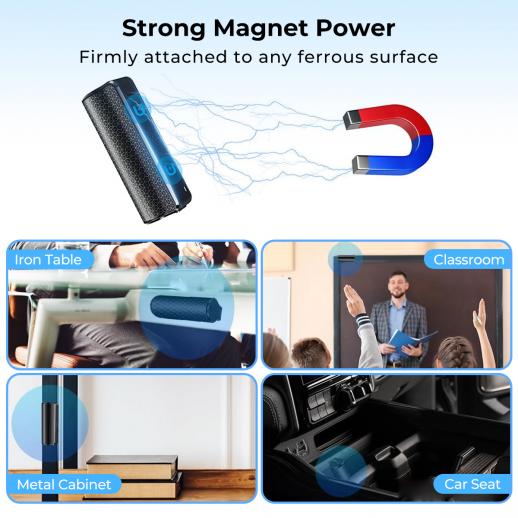 Dotato di magia a doppio magnete, il registratore vocale magnetico può attaccarsi saldamente a qualsiasi superficie ferrosa, senza mai preoccuparsi di mal posizionamento o perdita. Adatto per attaccarlo sotto il tavolo, sulla maniglia della porta, sul cruscotto, ecc.