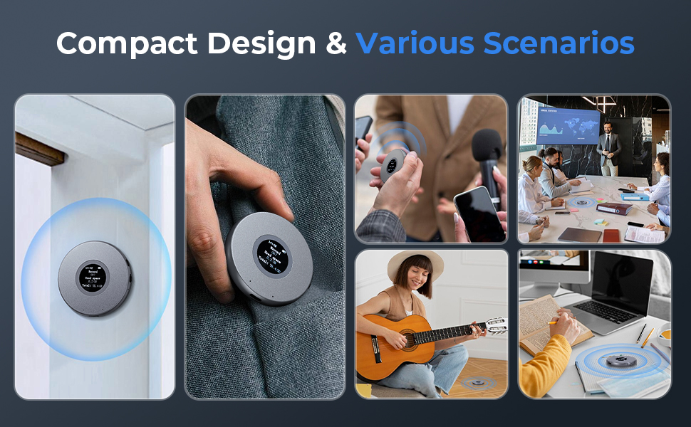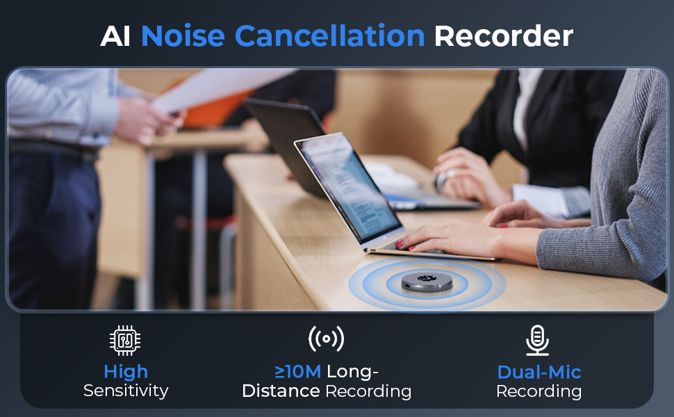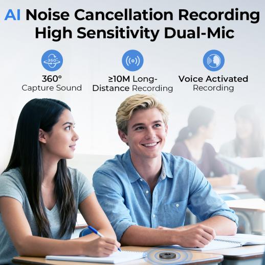 - Dotato di "doppi microfoni ad alta sensibilità" e avanzata tecnologia di elaborazione audio basata sull'IA, questo dispositivo di registrazione cattura il suono con una nitidezza eccezionale fino a **10 metri di distanza** — la lunghezza di una sala riunioni standard! A differenza dei registratori base che catturano solo suoni ovattati e lontani quando non sei vicino all'altoparlante, il nostro sistema a doppio microfono filtra il rumore di fondo in tempo reale, offrendo ogni volta un audio nitido e di qualità professionale.