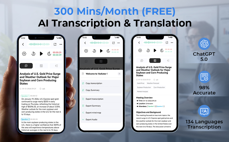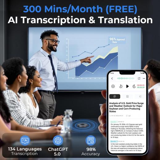 La nostra trascrizione utilizza la tecnologia ChatGPT 5.0 con una precisione del 98%, supportando 134 lingue. Ricevi 300 minuti di trascrizione e traduzione gratuiti ogni mese, senza necessità di abbonamenti aggiuntivi per l'uso di base.