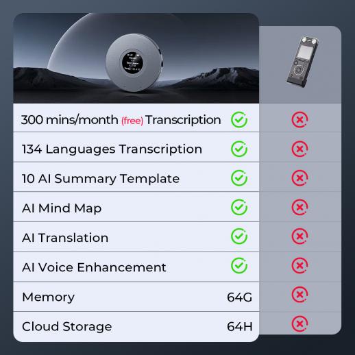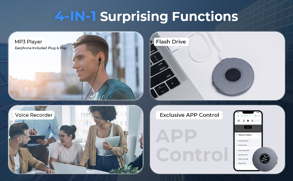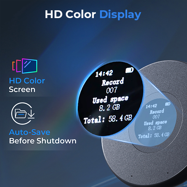 - Innanzitutto, è un **registratore vocale AI** professionale con tutte le funzionalità intelligenti che già ami: cattura del suono a 360°, riepiloghi automatici, registrazione a comando vocale e altro ancora. Ma non finisce qui — è anche un **lettore MP3** completamente funzionante, con cuffie incluse pronte all'uso, senza necessità di configurazione aggiuntiva. Funziona persino come **unità flash** portatile — basta collegarlo al computer e trascinare i file, senza software aggiuntivo. E con l'esclusivo **controllo APP**, puoi gestire tutte le registrazioni, modificare le impostazioni e accedere alle funzionalità AI direttamente dal telefono, in modo completamente wireless.