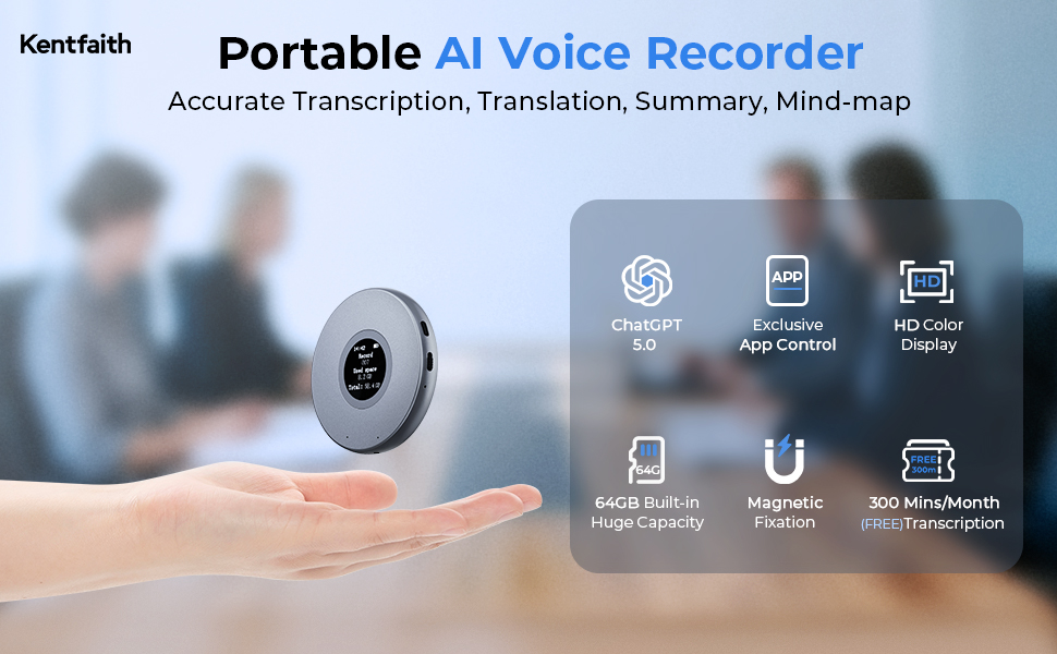Kentfaith Registratore Vocale Portatile AI, Trascrizione Precisa, Traduzione, Riassunto e Mappa Mentale. Tutte le Funzionalità Intelligenti di Cui Hai Bisogno, in un Registratore Tascabile.