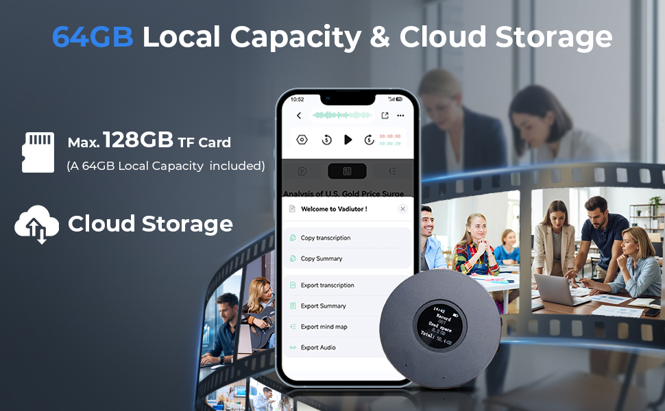 - Ottieni **64 GB di memoria locale integrata** direttamente sul registratore vocale: spazio sufficiente per archiviare oltre 750 ORE di registrazioni di alta qualità, così puoi registrare settimane di riunioni, lezioni o interviste senza mai dover eliminare un file. Inoltre, per maggiore sicurezza, tutte le tue registrazioni vengono automaticamente salvate anche sul cloud, quindi anche se perdi o danneggi il registratore, ogni singolo file è al sicuro e accessibile da qualsiasi dispositivo.