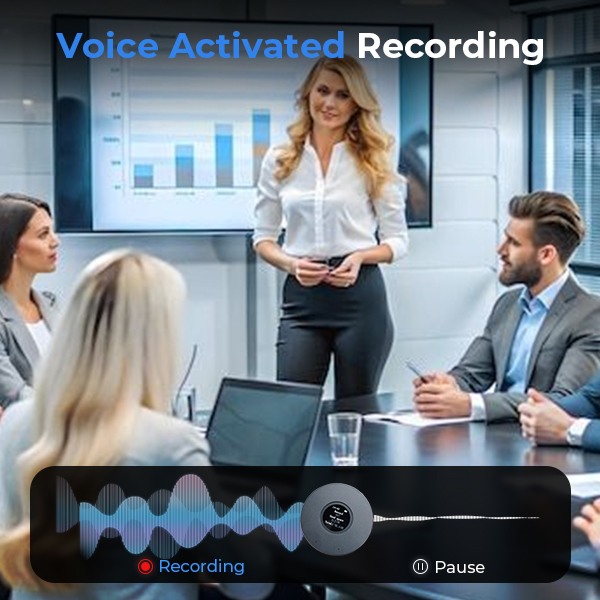 - Niente più dover premere manualmente il tasto di registrazione e pausa ogni volta che la conversazione inizia e si interrompe. Il nostro dispositivo di registrazione intelligente rileva automaticamente quando qualcuno sta parlando e inizia a registrare all'istante — quando la conversazione si interrompe, si mette in pausa automaticamente. Ciò significa niente più file enormi pieni di inutili silenzi, niente più spazio di archiviazione sprecato e niente più dover avanzare velocemente attraverso ore di audio vuoto per trovare le parti di cui hai bisogno.