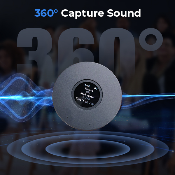 - A differenza dei registratori unidirezionali di base che captano solo il suono direttamente di fronte a loro, il nostro registratore vocale AI cattura audio cristallino da **ogni direzione contemporaneamente** — davanti, dietro, sinistra, destra, persino le persone sedute dietro il dispositivo. Che tu sia in una riunione di team intorno a un tavolo, in una discussione a tavola rotonda o in un brainstorming di gruppo, la voce di ogni oratore arriva forte e chiara, indipendentemente dalla loro posizione.