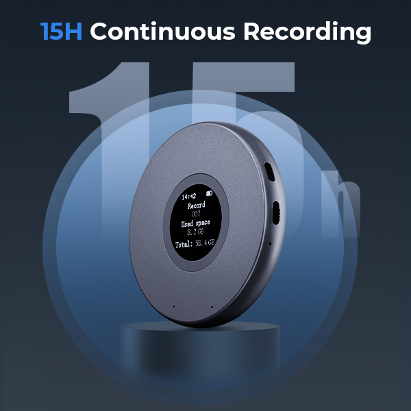 - Una singola carica completa ti offre **15 ore intere di registrazione ininterrotta** — abbastanza per coprire un'intera giornata lavorativa di riunioni consecutive, una conferenza accademica di un'intera giornata o persino un'intera giornata di interviste sul campo, senza bisogno di collegare o cambiare le batterie a metà. A differenza dei registratori economici che si esauriscono dopo solo 3-4 ore di utilizzo, la batteria del nostro dispositivo di registrazione è progettata per tenere il passo con i tuoi giorni più impegnativi.