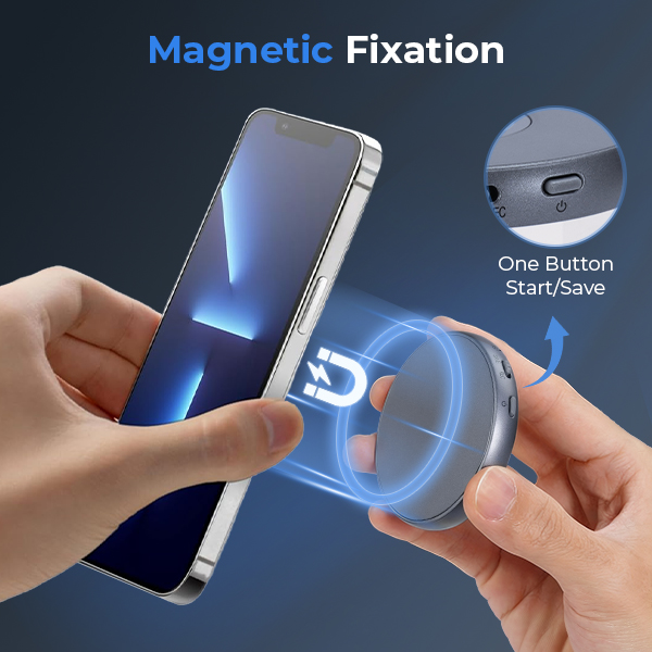 - La base magnetica integrata ti consente di fissare saldamente il registratore su qualsiasi superficie metallica. E quando devi iniziare a registrare, basta premere **un solo pulsante** per avviare e premere di nuovo per salvare. Il nostro registratore vocale con IA ti permette di configurarlo in 2 secondi e iniziare a catturare la conversazione all'istante, così non perderai mai una sola parola importante.