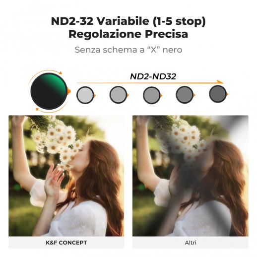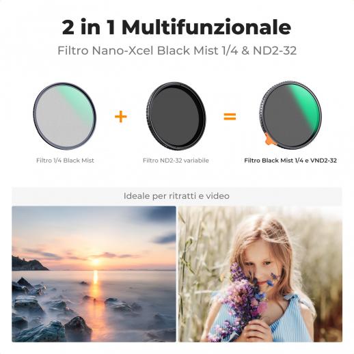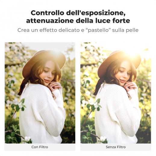 - * 【Filtro VND e Diffusione Nero 1/4 Funzione 2 in 1】Un filtro ha le caratteristiche del filtro effetto ND e diffusione nera 1/4, non solo può controllare la quantità di luce che entra nell'obiettivo tramite la regolazione (1-5 stop), ma anche crea effetti cinematografici da sogno per foto e video.