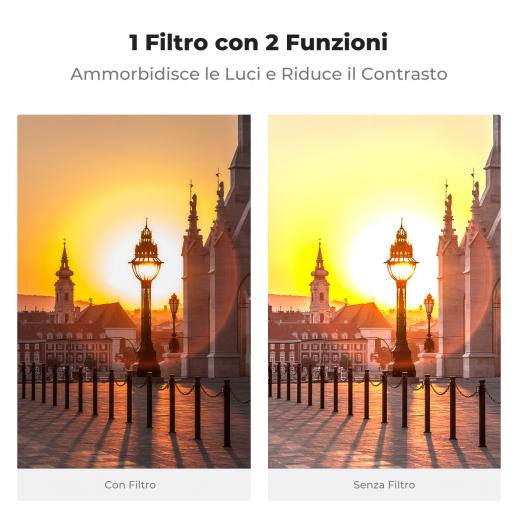 - * 【Filtro ND variabile e effetto di diffusione 2 in 1】 Un filtro ha entrambi le caratteristiche del filtro ND e dell'effetto di diffusione del nero, non solo fornendo esigenze di riduzione della luce, ma può anche evidenziare bagliori morbidi e abbassare il contrasto per creare un effetto sognante per video o foto .