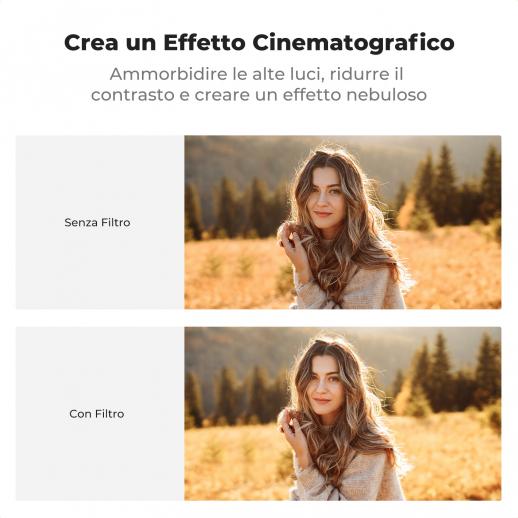 - * 1. Dotato di un filtro nero morbido da 67 mm 1/8, che ammorbidisce le alte luci, riduce il contrasto, ammorbidisce i dettagli dell'immagine e può produrre un effetto alone in un ambiente con sorgente luminosa, aumentando il senso artistico e il romanticismo sognante dell'immagine.