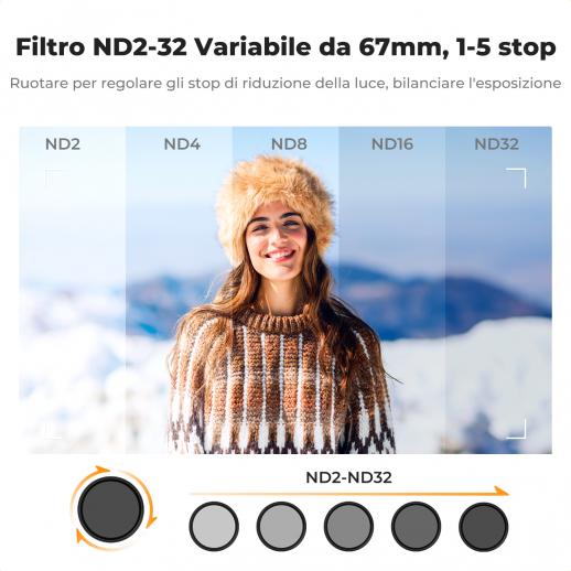 - * 1. Dotato di un filtro ND2-32 regolabile da 67 mm, può raggiungere 5 livelli di densità neutra regolabile. È possibile regolare l'intensità del filtro a densità neutra in base alle esigenze per adattarsi a diversi ambienti di illuminazione.
