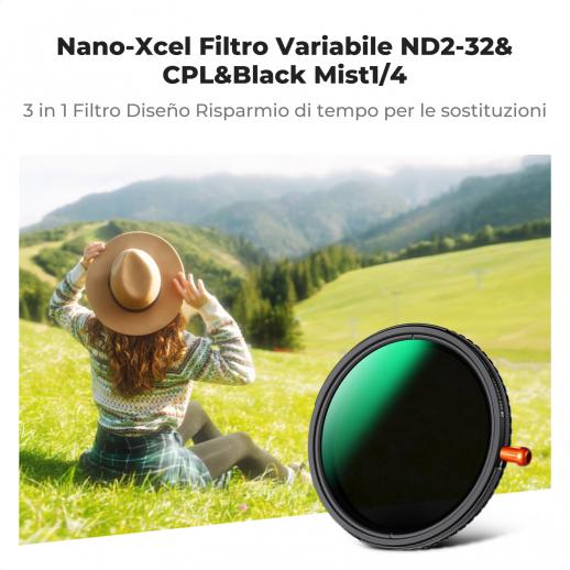 Questo filtro attenua rughe, lentiggini e pori della pelle, creando un effetto cinematografico. È ideale per ritratti e video e mi dona un aspetto morbido e accattivante. Mi permette di regolare la densità neutra da ND2 a ND32, dandomi la flessibilità di controllare la quantità di luce che entra nell'obiettivo. È perfetto per le situazioni luminose, consentendomi di utilizzare tempi di posa più lunghi o diaframmi più ampi. Il suo vetro è di eccellente qualità, il che mi garantisce un'ottima trasmissione della luce e resistenza ai graffi. La sua montatura ultrasottile previene la formazione di angoli scuri su obiettivi grandangolari e teleobiettivi. Include un filtro polarizzatore CPL che elimina i riflessi indesiderati da superfici non metalliche come acqua e vetro, migliorando il contrasto e la saturazione del colore. I rivestimenti bifacciali a 28 strati garantiscono resistenza a polvere e graffi, offrendomi risultati eccellenti. Consiglio questo filtro per catturare immagini straordinarie con riflessi ridotti e colori migliori, sia in fotografia che in video.